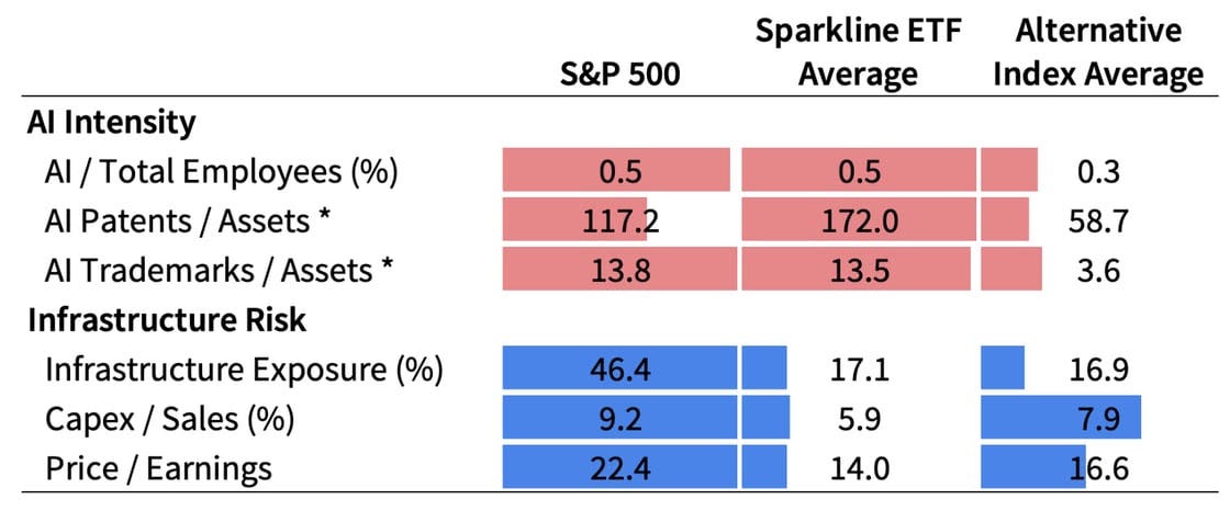 The S&P 500 is heavily concentrated in risky AI infrastructure stocks, while popular alternatives (e.g., value stocks) are dominated by AI laggards. The Sparkline ETFs offer a third path - AI early adopters.