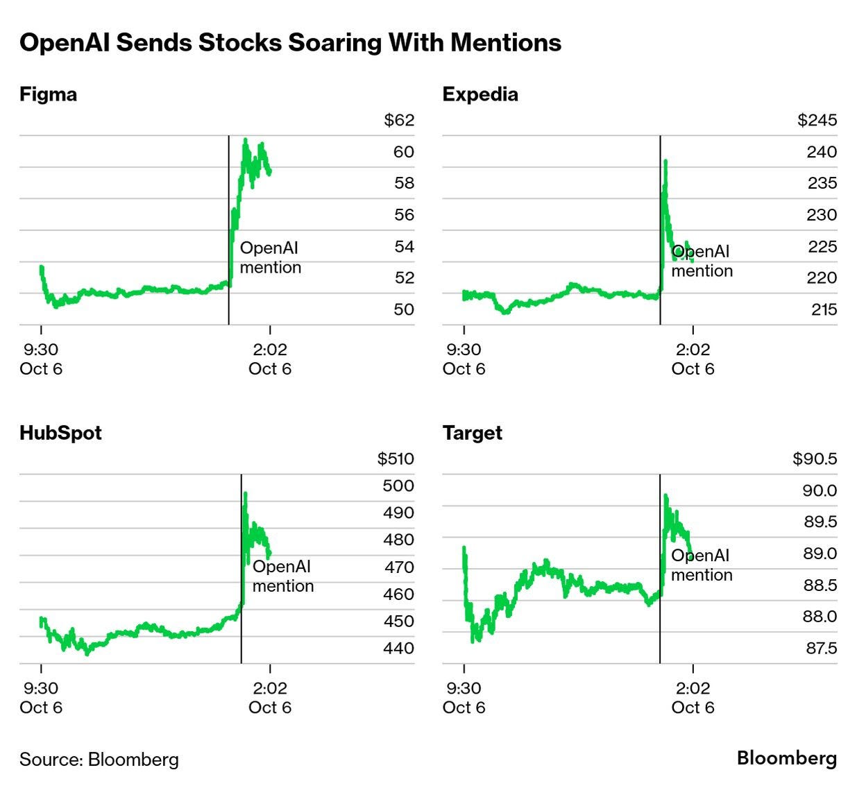 It’s not just jumbo deals — a mere mention at OpenAI’s annual developers event was enough to push up a whole host of stocks, like Figma, HubSpot and Salesforce. Most were named as partners whose apps are being incorporated into ChatGPT. Even CEO Sam Altman admitted his company’s impact on other stocks is “weird.”