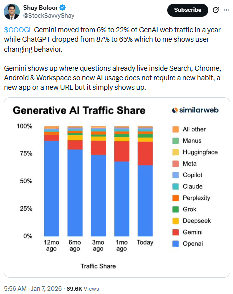 Mindshare Reclamation (Gemini): For a year, GPT was the only acronym that mattered. That has changed. Our data shows Gemini is increasingly chipping away at OpenAI’s mindshare. By integrating Gemini directly into the Workspace and Search ecosystem, Google didn’t have to find users. The users were already there. They simply upgraded the engine while the car was still running.