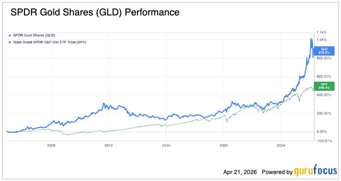 For what it is worth, gold has absolutely beaten the pants off of stocks over the past two decades. Since November 2024, when the launch of the SPDR Gold Shares (GLD) really made gold accessible to rank and file investors for the first time, the price of GLD is up 876%.